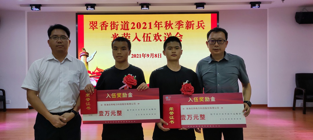 自參與珠海市征兵工作以來(lái),優(yōu)特科技已先后輸送5名員工入伍。因積極響應(yīng)珠海市征兵工作號(hào)召,高度重視征兵工作,優(yōu)特科技獲評(píng)“香洲區(qū)2020年度征兵工作特別貢獻(xiàn)單位”。